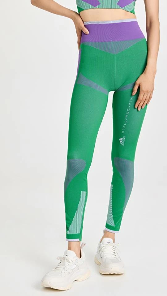 Eclectic mixed patterning and logo lettering brings an eye-catching look to these adidas by Stella McCartney leggings, an ideal pair for medium-impact workouts.