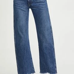 An easygoing pair of Khaite’s signature Kerrie wide-leg jeans, given a more relaxed feel with frayed cuffs and heavy fading and whiskering.