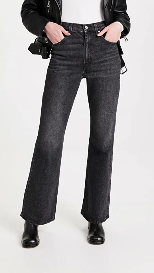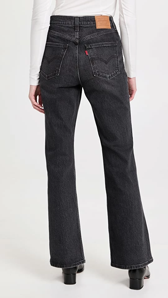 A classic style from a classic brand! Sure to be a new favorite addition to your denim collection, these high-rise Levi’s jeans are crafted from faded black fabric and feature a ’70s-inspired flare silhouette. Go for a cool two-tone look by pairing them with a white pullover and black leather boots.